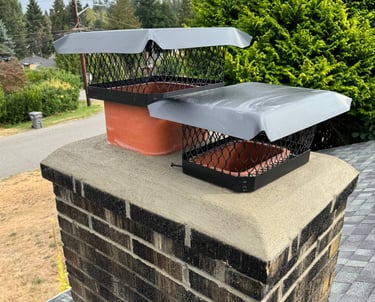 Our team removed the old cracked mortar, rebuilt the crown using high-strength concrete mix, and installed two custom stainless-steel chimney caps to ensure long-term protection from rain, debris, and animals.