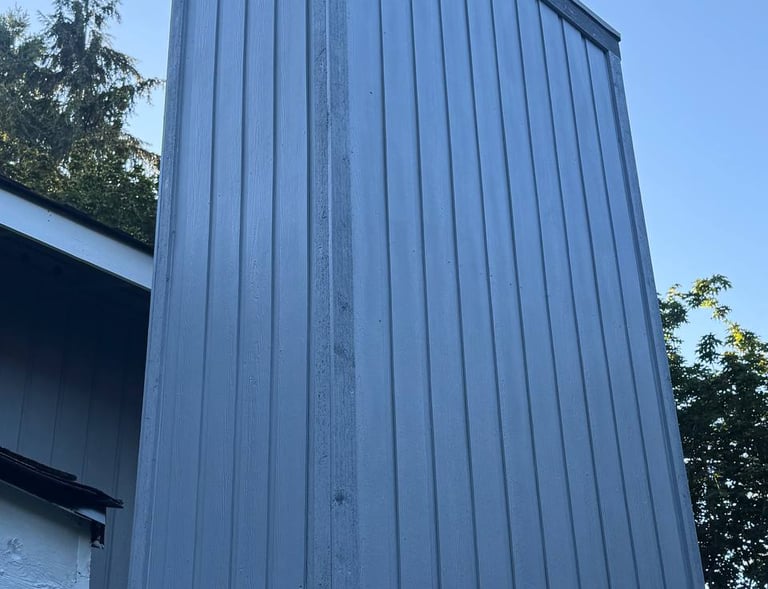 Full restoration of a damaged chimney: replacement of deteriorated siding, surface repair, and complete painting for improved protection and a refreshed, modern look.